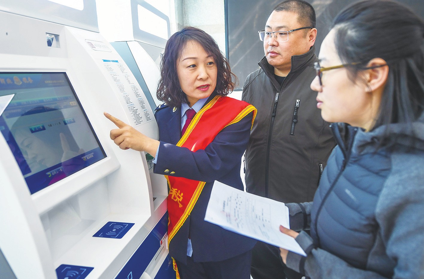 为确保减税降费落到实处,河北省廊坊市广阳区不断创新服务方式,简化办税流程,设立减税降费业务专门窗口、减税降费政策咨询窗及办税自助服务机,大大提高企业办税速度。同时,依托发放宣传手册、扫描办税事项“二维码”等多种平台和方式,广泛宣传和解读减税降费政策,让更多企业切实享受实惠。图为在河北省廊坊市广阳区税务大厅,导税员指导企业办事人员利用办税自助服务机办理业务。
