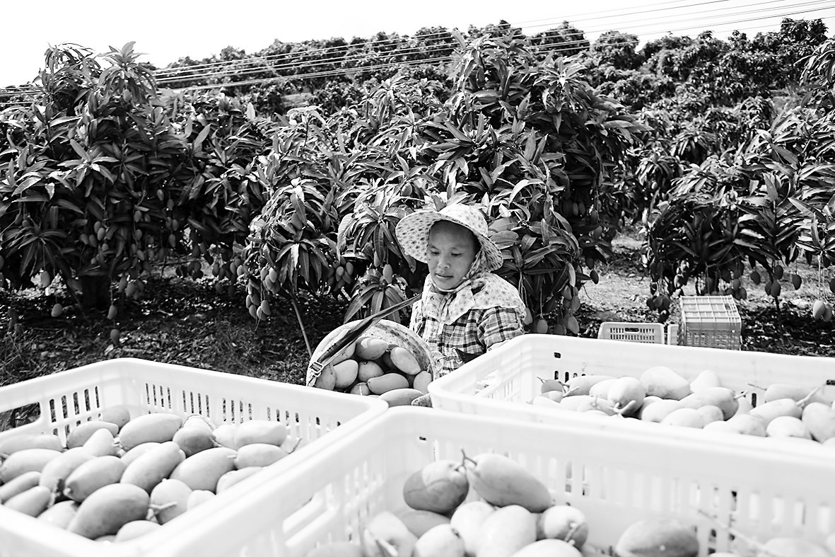 眼下是海南三亚芒果的采摘上市高峰期,芒果种植基地内一片丰收景象。近年来,三亚市利用独特的地理位置和优越的生长环境,大力扶持发展以三亚芒果为代表的热带特色高效农业。2018年全市芒果种植面积近38万亩,产量约65万吨,产值近50亿元。图为在海南省三亚市崖州区福返芒果种植基地,农民将采摘的贵妃芒果装箱。