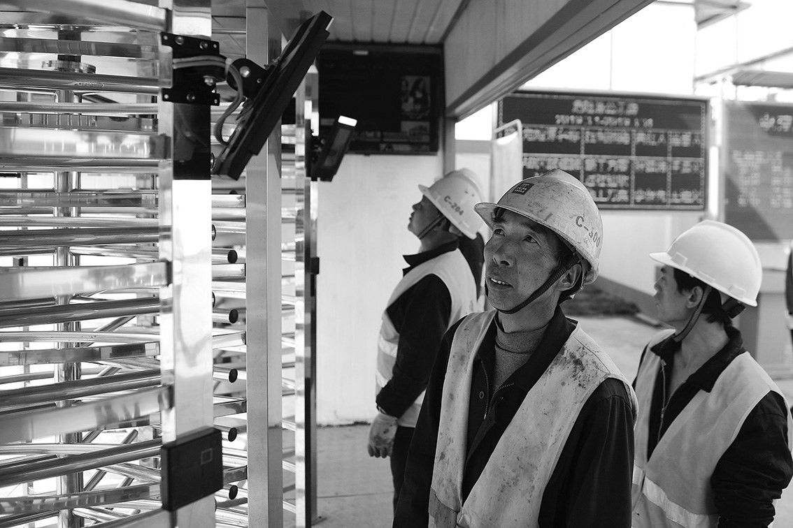 近日,一套“智慧工地”管理系统在中建三局承建的“浙江智慧之门”项目施工现场投入应用,包括工人实名制通道、物联网数控中心、“工地大脑”等智慧化施工管理技术。图为工人在实名制通道使用人脸识别技术进入“浙江智慧之门”项目工地。黄宗治/摄