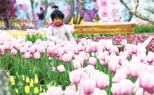 暖春四月,在甘肃省兰州市榆中县境内的李家庄田园综合体,近万株郁金香竞相盛开,吸引不少游客和市民前来欣赏。图为在榆中县李家庄田园综合体内,小朋友在郁金香花丛中嬉戏。