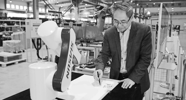 日前,沈阳新松机器人自动化股份有限公司创始人兼总裁曲道奎和公司生产的机器人互动。目前,新松已发展成为拥有多家控股子公司、国际上品牌产品线最全的机器人上市企业。在5000余名员工中,研发创新团队占比达75%以上,产品成功出口全球35个发达国家和地区,公司市值跻身国际同行业前三位,被业内誉为“中国智造”升级的重要支撑之一。杨青/摄