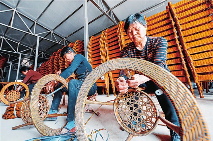 近日,河北省邯郸市肥乡区东漳堡镇东南口村村民在编织藤椅。