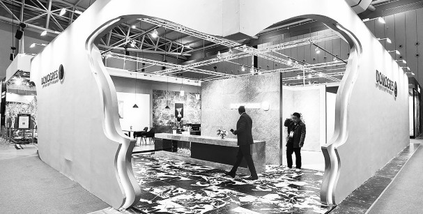 在4月19日至22日广东佛山举办的2019中陶产品展上,中国本土各类新型陶瓷砖纷纷亮相,还吸引来自意大利、马来西亚、印度、印度尼西亚等国家的陶瓷企业参展。图为在2019中陶产品展上,参展企业打造了设计感强烈的展示空间。