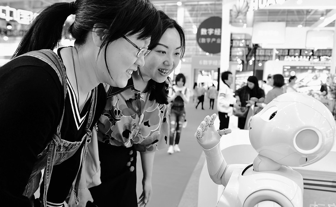 5日,第二届数字中国建设成果展览会在福州海峡国际会展中心开馆。展览将持续至5月9日。第二届数字中国建设峰会将于5月6日至8日在福州举行。图为两名观众与智能机器人互动。魏培全/摄