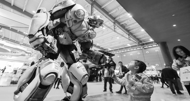 15日,2019长沙国际工程机械展览会在湖南长沙国际会展中心开幕,全球1000余家工程机械企业携新技术成果及新产品参展。图为在长沙国际工程机械展览会上,小朋友和机器人互动。