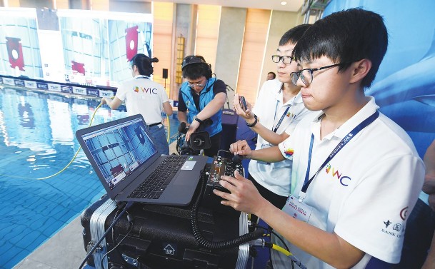 2019世界智能水下机器人挑战赛在天津滨海高新区举行。本次挑战赛以“寻梦水世界,智能赢未来”为主题,共有国内外10余支队伍参赛。图为来自中国海洋大学参赛队的选手在操控水下机器人。