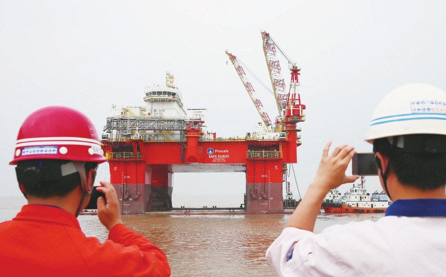 日前,由江苏启东中远海运海洋工程有限公司建造的半潜式海洋生活服务平台“高德4号”出海试航。“高德4号”全船共设有237个双人间和26个单人间,可供500人生活居住和240人同时用餐。图为工作人员拍摄出海试航的半潜式海洋生活服务平台“高德4号”。