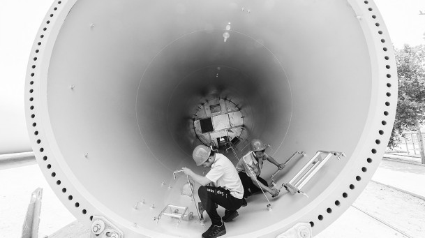 铁塔是河北景县的重要产业,近年来,针对通讯塔市场饱和局面,该县积极推进传统铁塔产业转型升级,引导企业调整产品结构,由通讯塔行业向电力塔、风力塔等相关联的绿色能源行业转型。目前,当地已为中国风电系统多个部门承建风电塔筒4000余基。图为河北景县的洁绿重工有限公司工人在风电塔筒内部安装零部件。