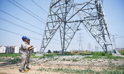 25日,国网天津检修公司特高压输电运检室无人机巡检班的电力工人依照“迎峰度夏特巡”要求,在鲁固、锡泰、廊河三条特高压输电线路并行处开展无人机巡检工作,确保输电安全。图为电力工人操作无人机准备开始巡检工作。