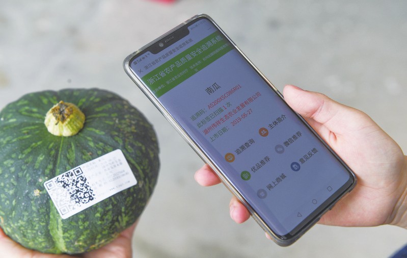 2018年起,浙江省湖州市织里镇农业部门开始推进农产品质量安全追溯系统。消费者只要扫一扫二维码就能清楚地了解所购买蔬菜从育苗到采摘等环节的一系列信息。图为手机扫一扫有机南瓜上的农产品二维码。