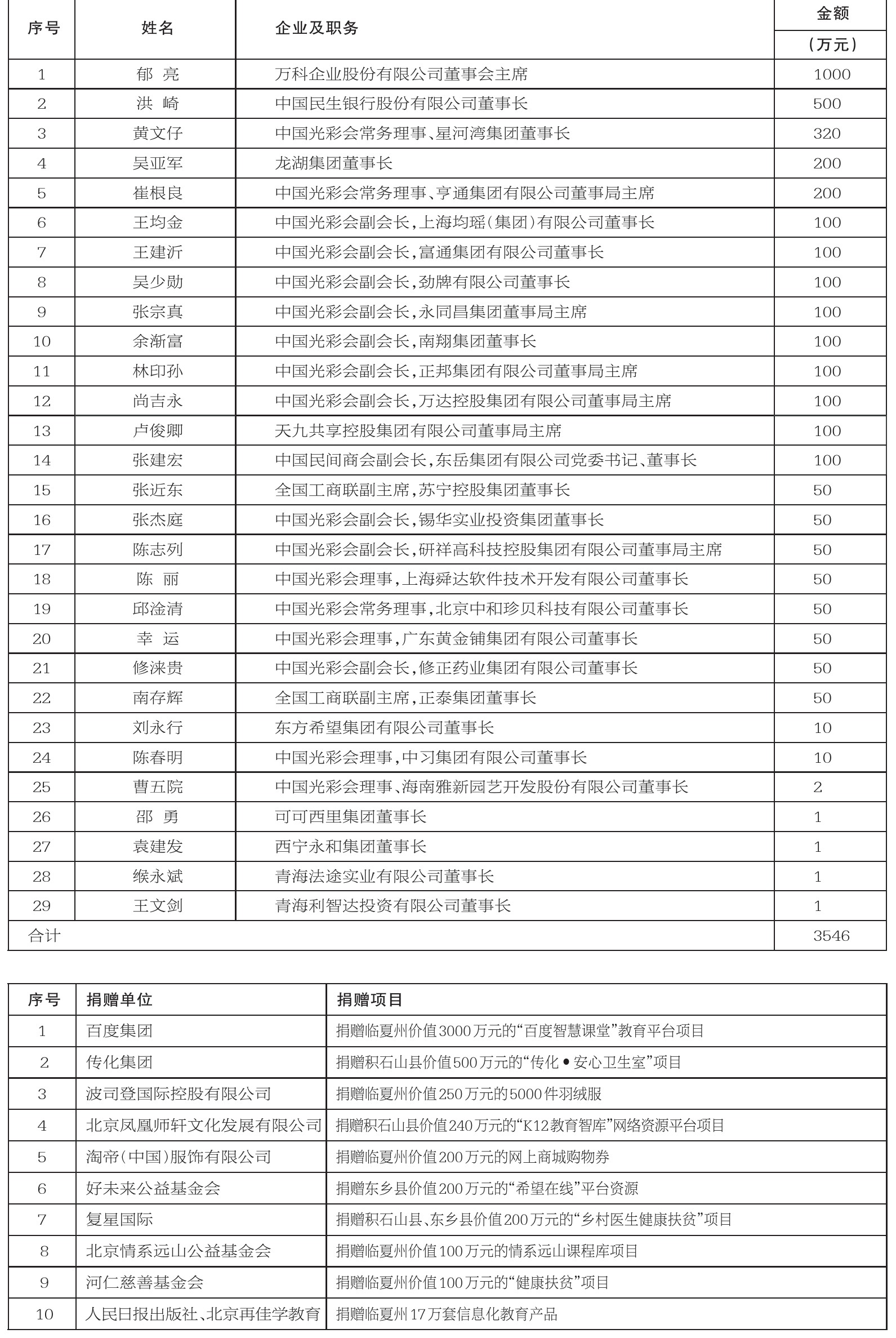 2019年,中国光彩事业促进会组织“中国光彩事业临夏行”活动,光彩会理事和非公有制经济人士积极支持甘肃省临夏州公益事业,已确定和承诺的公益捐赠金额8000多万元,其中现金捐赠3546万元。