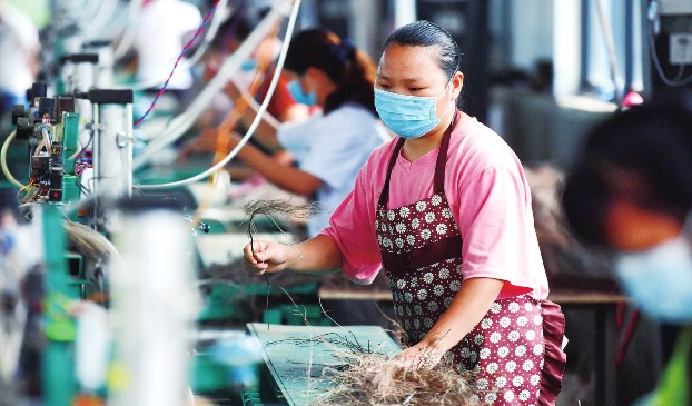 近年来,广东湛江市遂溪县和广西柳州市融安县结成帮扶对子,遂溪县把技术和资金优势送到融安县,通过开设粤桂扶贫车间,利用融安县当地丰富的竹木资源和劳动力优势,生产竹、木、藤质的篱笆。仅此一项可实现年产值1.2亿元,吸收和安排300名贫困户就业。据统计,自粤桂扶贫协作以来,广东遂溪县为广西融安县实施项目34个,通过招商引资引进两家粤企在融安落地,共建粤桂扶贫产业园1个,引导5家企业入驻。图为在广西柳州市融安县融嘉工艺有限公司扶贫车间,工人在生产线上作业。