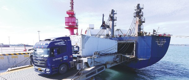 目前,福建平潭至台北、台中、高雄高速客滚直航航线已实现全覆盖,“海峡号”“丽娜轮”“台北快轮”3船齐开、3线并行。图为在平潭港金井码头,集装箱运输车从“台北快轮”上运出台湾农渔产品。
