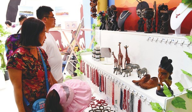 8月1日,2019年中国北京世界园艺博览会“贝宁国家日”活动在北京世园会园区举行。图为观众在世园会园区贝宁共和国展区参观。