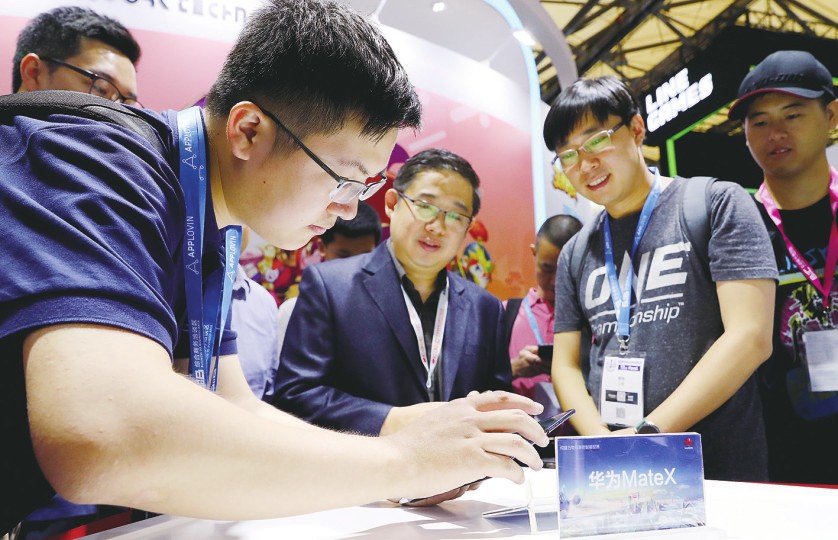 日前,中国国际数码互动娱乐展览会在上海新国际博览中心开幕。展览涵盖游戏、动漫、互联网影视与音乐、电子竞技、智能娱乐软硬件及新生娱乐业态等数字娱乐产业的众多领域。图为参观者在展会现场体验手机产品。