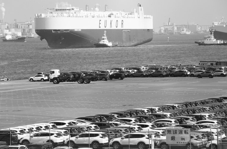 日本财务省19日公布的数据显示,日本7月份出口额同比下降1.6%至6.6432万亿日元,连续8个月同比下降;同时,进口额同比下降1.2%至6.8928万亿日元,连续3个月同比下降。图为在日本横滨港拍摄的出口汽车。