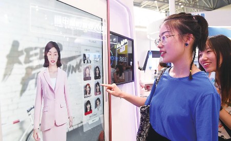 27日,在重庆国际博览中心举行的2019中国国际智能产业博览会进入第二天。在本届智博会上,各类“职业智能科技”成为观众关注的热点。图为观众在智博会现场体验服装行业的“一分钟换装技术”。