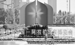 第四届中国—阿拉伯国家博览会将于9月5日至8日在宁夏银川举办,目前博览会各场馆准备工作已进入收尾阶段。图为市民在第四届中国—阿拉伯国家博览会的会标前拍照。