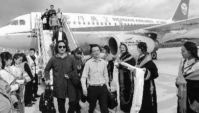 日前,随着3U8013次航班落地,四川甘孜格萨尔机场正式通航。该机场的通航将成都到甘孜州康北腹地的交通时长缩短至1小时。图为乘坐3U8013次航班的旅客走下飞机。