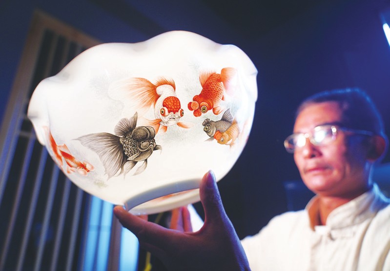 熊国安是江西景德镇传统薄胎瓷制作技艺传承人。薄胎瓷的精华在利坯工艺。凭借极致的手工技艺及数十年如一日的专注,熊国安将难度最高的窑变荷叶边薄胎碗做到0.15毫米的厚度。图为这是熊国安和他制作的窑变荷叶边金鱼薄胎碗。