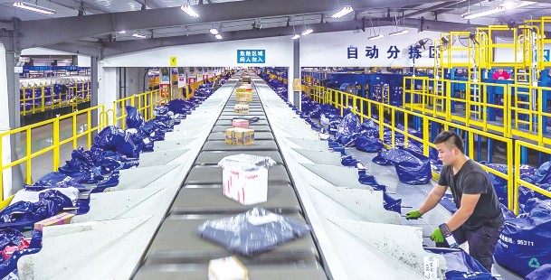12日,快递企业迎来“双十一”后的物流高峰。图为中通快递上海转运中心内自动化流水线。
