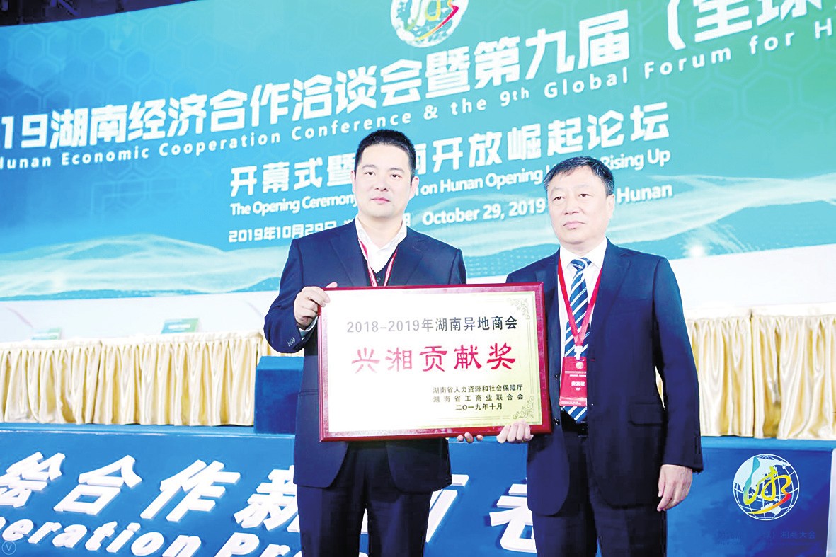 湖南省江苏商会围绕"树立四个意识,创建一流商会"的发展目标,励精图治,获得湖南省委省政府、省工商联及各级组织、领导的肯定。图为湖南省江苏商会会长魏善军在第九届(全球)湘商大会上领取由湖南省政府颁发的"兴湘贡献奖"。
