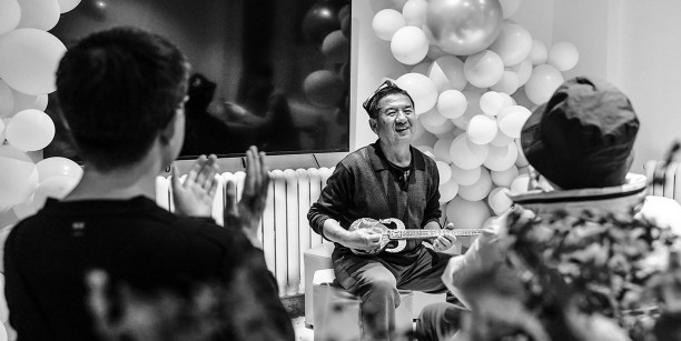 入冬以来,冰雪资源富集的乌鲁木齐通过滑雪业、观光业以及传统文化节事,带热冬季旅游,今冬计划举行60项以“旅游+乐雪+文化+美食+博览”为主题的冬季旅游活动。图为乌鲁木齐县“春野沐心舍”民宿经营者马青(中)和游客一起唱歌。