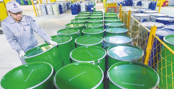 近年来,河北景县通过提供一系列惠企政策,积极引导本县涂料生产企业与高等院校合作,设立研发中心,研发环保新产品。据悉,该县涂料生产企业研发生产的高性能环保涂料达10余款,可应用于工业厂房、仓储物流、屋顶和外墙建筑以及家用电器等领域。图为河北景县一家涂料生产企业工人在摆放环保涂料包装桶。