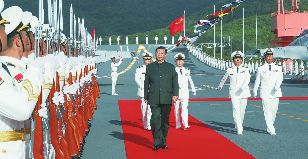 (图)12月17日,我国第一艘国产航空母舰山东舰在海南三亚某军港交付海军。中共中央总书记、国家主席、中央军委主席习近平出席交接入列仪式并登舰视察。这是仪式结束后,习近平登上山东舰,检阅仪仗队。