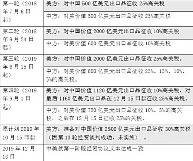 一是美方的承诺:美国取消原计划于12月15日起对中国价值1600亿美元产品征收的高关税;将原计划对中国价值1200亿美元产品征收的关税从15%降到7.5%;原计划对中国价值2500亿美元产品征收25%的关税,保持不变。