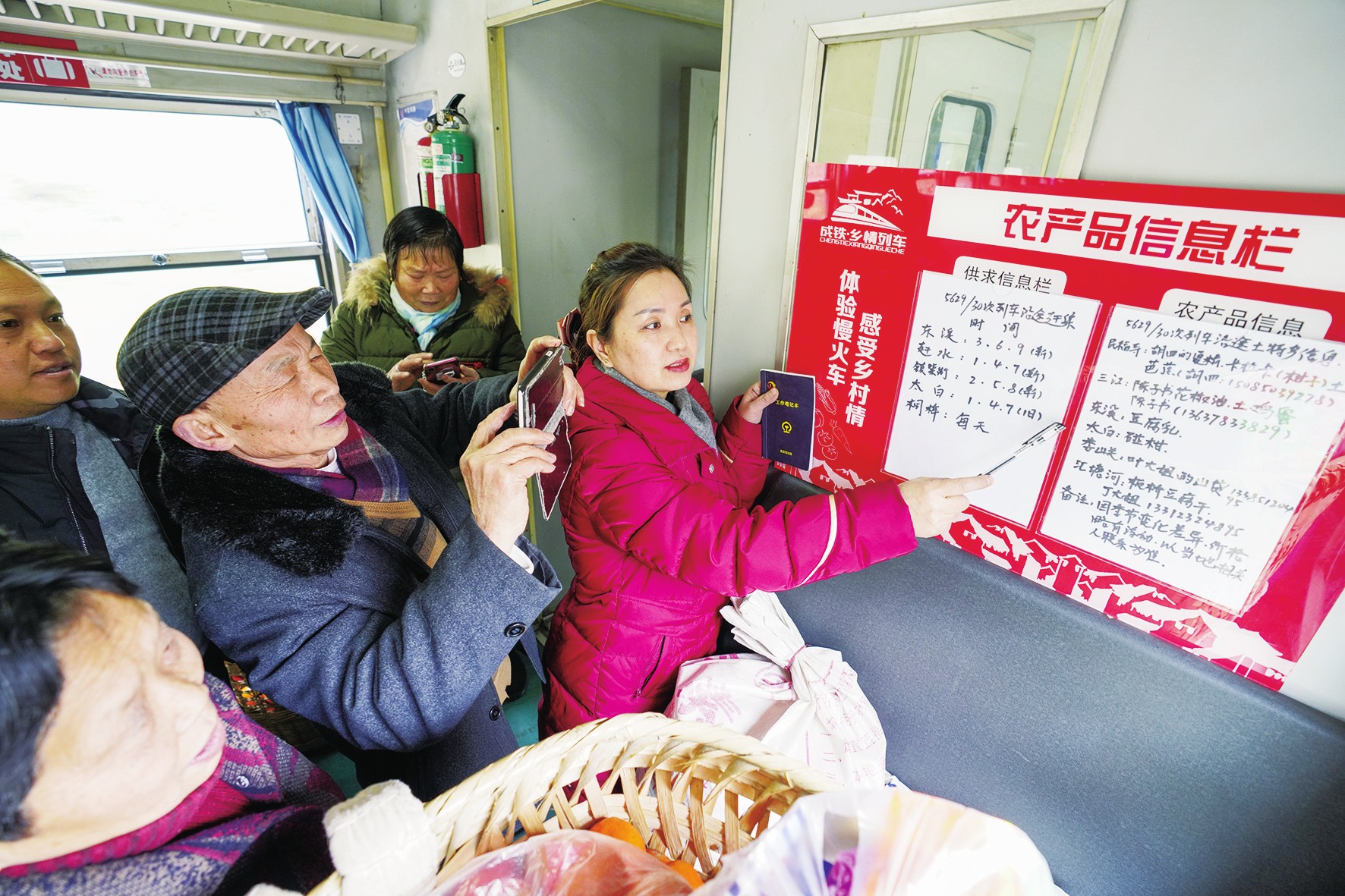 5629/5630次列车,是穿梭在重庆、遵义间的“慢车”,它从20世纪70年代开始运行,沿途停靠的26个站点,基本上全在深山里。这趟“经站就停”“七拐八绕”的慢车,极大方便了山区群众探亲访友、赶场买卖。为了帮助山区的群众把农产品卖上个好价钱,重庆客运段长期负责这条线的列车员们成立了“致富帮帮团”。他们和沿线一些老乡结“帮扶对子”,在列车上设置“农产品信息栏”,收集并登记沿线村民家里的土特产,帮助他们推销农产品,还为一些困难群众介绍工作。“致富帮帮团”成立数年来,帮助了数百名群众。图为在5629次列车上,列车广播员杜晓霞(右一)利用工作间隙在车厢里给前来咨询的旅客介绍农产品信息栏里当日重点推介的农产品。