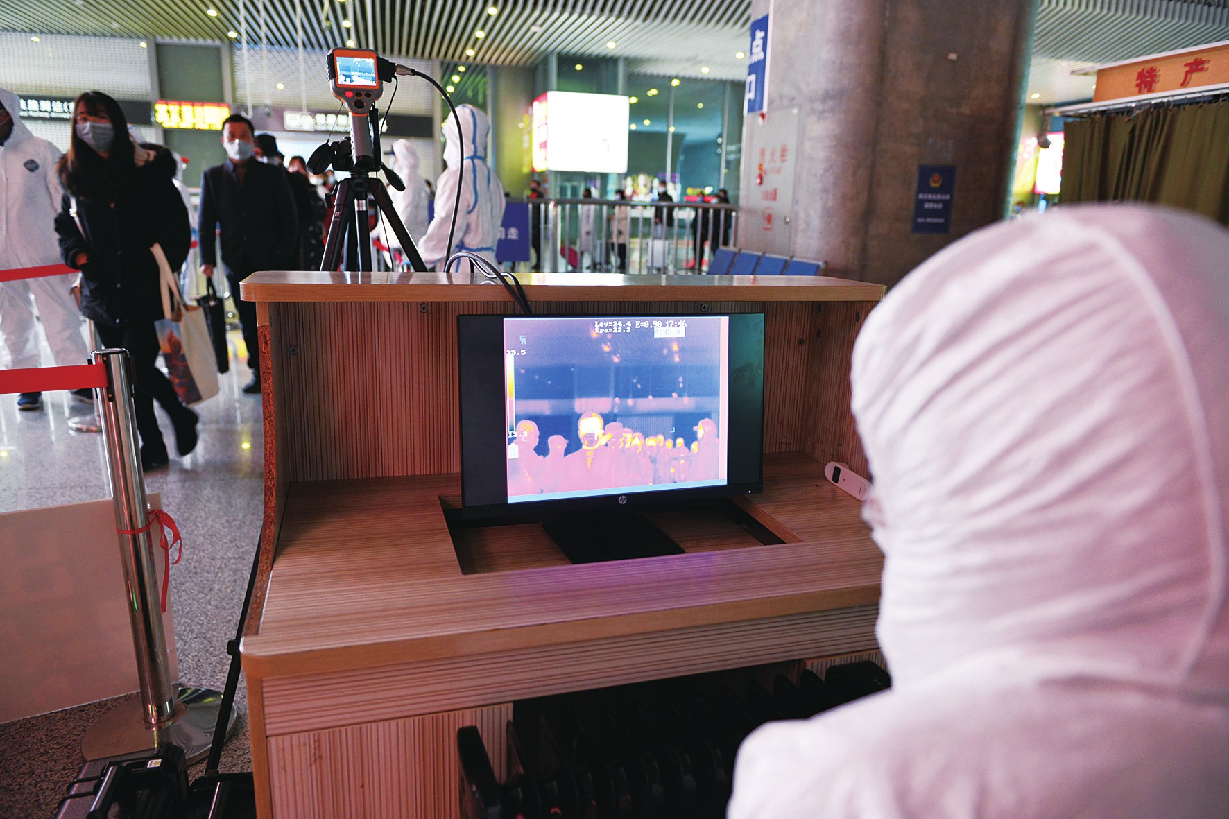 连日来,为应对新型冠状病毒感染的肺炎疫情,各地对辖区街道、公共设施等进行消毒,对往来人员加强体温检测,落实各项防控工作。图为在南京南站,工作人员使用红外体温计对旅客进行体温测量。