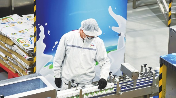 11日,记者在位于内蒙古呼和浩特市的伊利液态奶生产基地内看到,乳制品生产线满产运行,工人有序地操控生产设备,一盒盒牛奶经过装箱、码垛后进入库房,等待运输、供应各地。