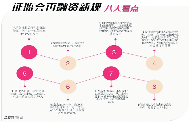 例如,调整非公开发行股票定价和锁定机制,将发行价格由不得低于定价基准日前20个交易日公司股票均价的9折改为8折;将锁定期缩短一半,由36个月和12个月分别缩短至18个月和6个月;将主板(中小板)、创业板非公开发行股票发行对象数量由分别不超过10名和5名,统一调整为不超过35名。