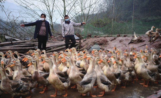 重庆市渝北区玉峰山镇双井村养殖户傅宗勇一家是当地的脱贫巩固户,疫情期间由于饲料断供以及活禽市场关闭,其养殖的300只商品鸭滞销。镇政府了解情况以后,帮助傅宗勇通过网络分散销售,同时安排活禽宰杀技术人员、畜牧兽医站工作人员和志愿者上门开展宰杀、检疫、包装配送等工作。目前,傅宗勇已接到156只商品鸭的销售订单。