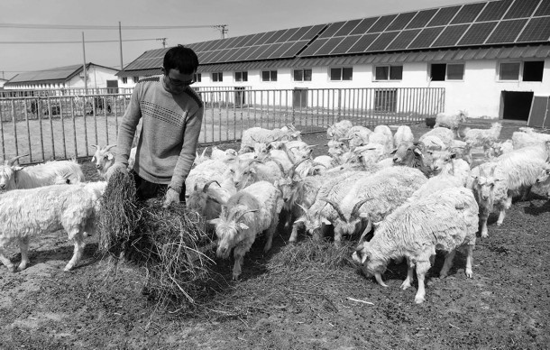 目前,阿格达拉镇扶贫养殖小区现有棚圈36个,进棚牲畜11000余头(只),273户建档立卡贫困户的富余劳动力转移至本地企业及大田务工。图为在青河县阿格达拉镇扶贫养殖小区,养殖户在喂羊。