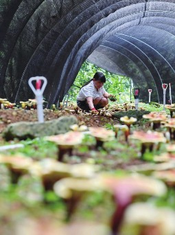 近年来,福建省永春县依托当地气候和良好的自然生态环境,引导群众发展柑橘、佛手茶、铁皮石斛、花卉等特色农业,实现农民脱贫致富,助推乡村振兴。图为女工王银美在永春县岵山镇一家农业生态庄园的荔枝林灵芝园除草。