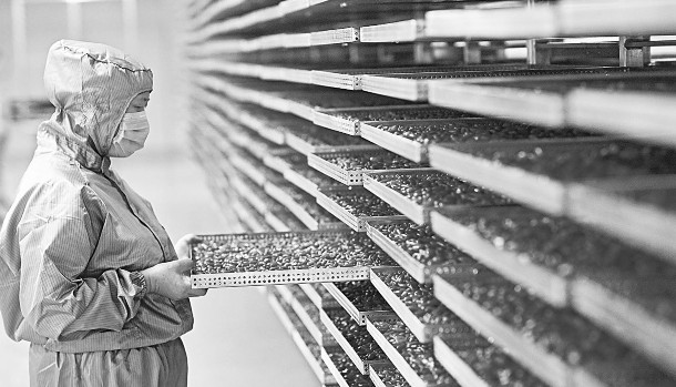 近日,宁夏百瑞源枸杞股份有限公司与中国农业大学合作科研项目——锁鲜枸杞工艺技术正式运行投产。宁夏枸杞在市场销售中以干果为主。锁鲜枸杞生产线的投产,突破了传统的枸杞制干技术,不破枸杞表面保护膜,让宁夏枸杞传统制干模式迎来了新的变革。工人在锁鲜枸杞生产线上检查产品质量。