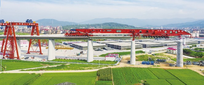 我国首台1000吨级高铁箱梁运架一体机在福厦高铁湄洲湾跨海大桥成功投入使用。1000吨级高铁箱梁运架一体机集提梁、运梁、架梁于一体,智能化程度高,可满足不同跨度的高铁箱梁施工作业。图为近日在福厦高铁湄洲湾跨海大桥施工现场,高铁箱梁运架一体机在架设1000吨箱梁(无人机照片)。