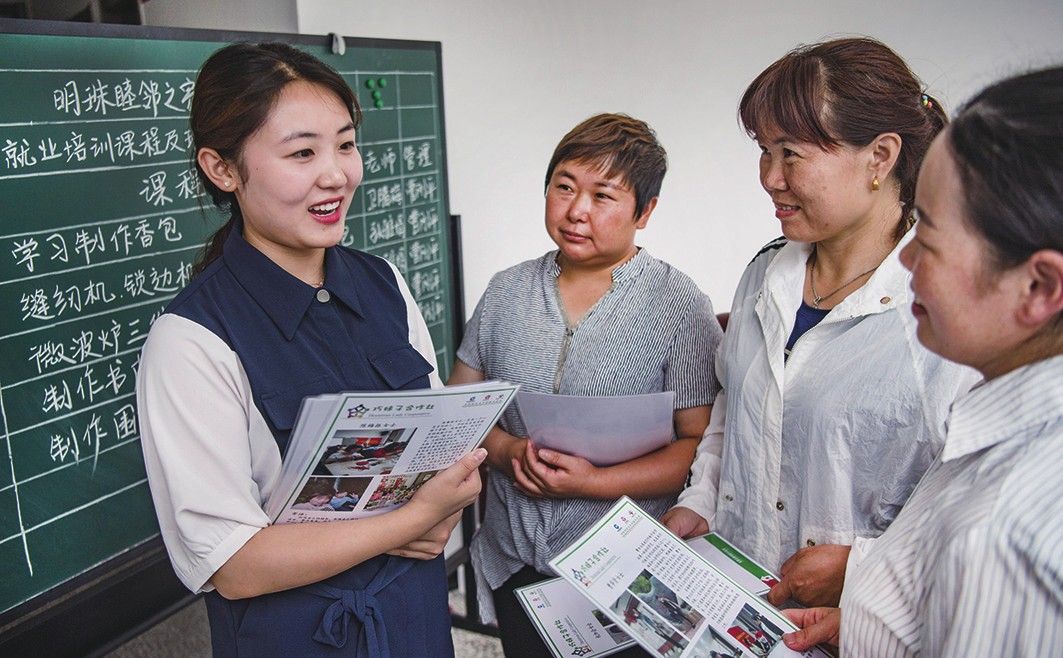 为了避免易地搬迁群众普遍存在的就业不充分、办事不方便、管理不到位等问题,岚皋县将工作重点从“搬得出”转向“稳得住”“能致富”,整合优化现有资源,创立“睦邻之家”管理模式。目前,岚皋县毗邻易地扶贫搬迁小区共培育农业园区159个、集体经济合作社134个,通过林地耕地入股、流转方式累计种植魔芋、猕猴桃等特色经济作物11万亩,带动贫困户3万多人实现稳定增收,3000余名搬迁群众就近到园区和家门口工厂务工,实现了“一人就业整户脱贫”的目标。今年2月,岚皋县已整体退出贫困县序列。易地搬迁群众与原住居民互融互通、互帮互助,过上了有收入、有服务、有劲头的新生活。图为岚皋县巧妹子合作社辅导员赵淑敏(左一)在民主镇明珠“睦邻之家”就业培训班上,解答学员的疑难问题。