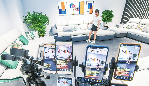 河北省香河县是我国北方重要的家居产品集散地。新冠疫情发生以来,香河国际家具城创新形式,鼓励商户采用直播的方式销售产品,增加销量,促进市场回暖。图为香河国际家具城的商户在直播。