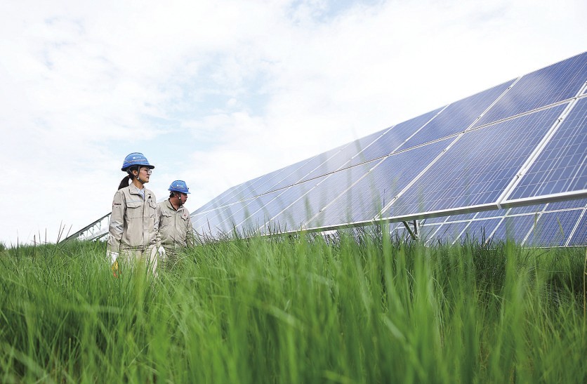 青海上半年清洁能源外送电量突破100亿千瓦时。图为在青海省海南藏族自治州共和县,工作人员在光伏电站内巡检。
