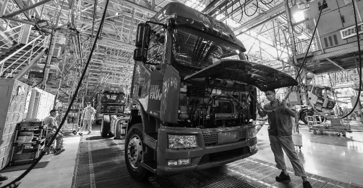 中国第一汽车集团披露,截至6月30日,集团上半年共计生产整车162.23万辆,同比增长1.5%;销售整车163.09万辆,同比增长2.3%。图为长春市的一汽解放总装车间,工人在装配车辆。