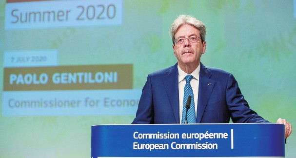 欧盟日前发布夏季经济预测报告说,由于放松新冠疫情防控措施的步伐比原计划缓慢,欧盟和欧元区今年经济萎缩程度将比此前预期更严重,明年复苏也将更缓慢。图为欧委会委员保罗·真蒂洛尼就欧盟经济预测出席新闻发布会。新华社/发