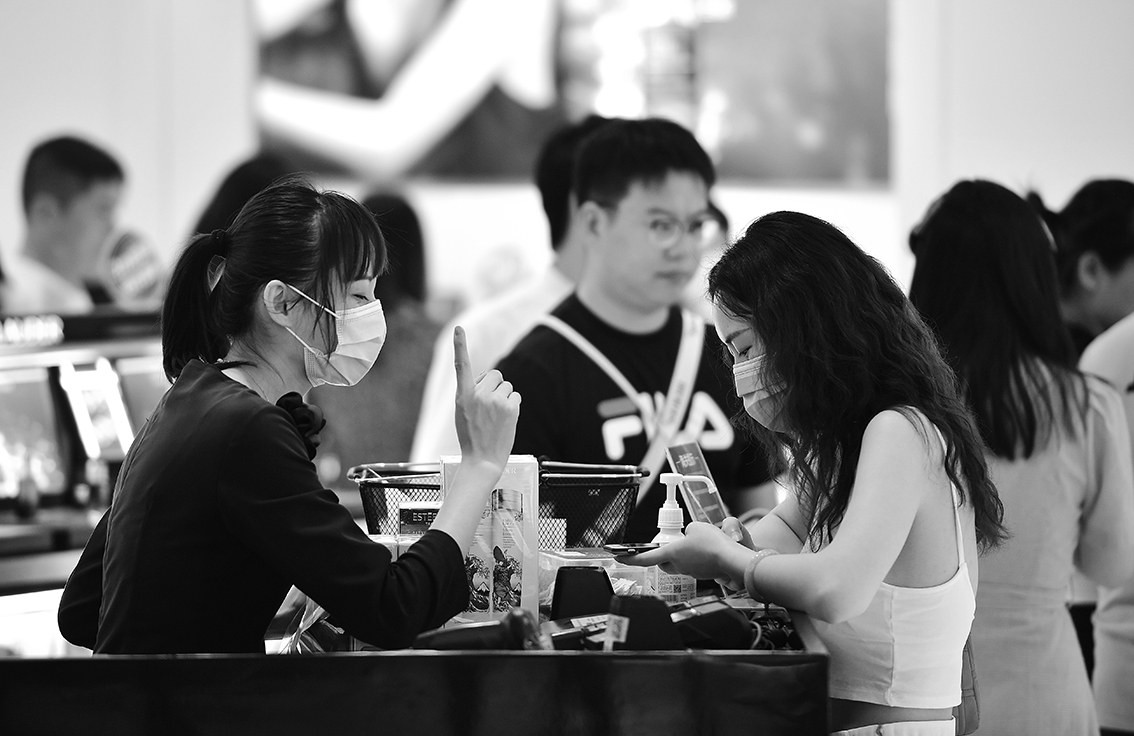 据海口海关统计,海南离岛旅客免税购物最新政策实施首月(7月1至31日),海关共监管离岛旅客购物38.4万人次、购物金额24.9亿元,较去年同期分别增长54.1%和2.3倍。图为8月18日,消费者在海口市日月广场免税店购物。