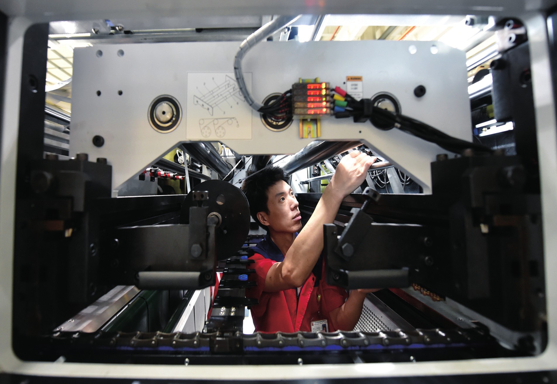 天津长荣科技集团股份有限公司自1995年成立以来,一直深耕于印刷装备制造领域,从一家只有十几人的小厂逐渐发展成为国内知名印刷装备制造企业。近年来,长荣科技打造贯穿生产全过程的智能化管理系统,实现了每一道工序可视化。疫情期间,充分发挥产业链协同优势,短时间内研发成功并生产出了口罩机。图为近日工作人员在该公司装配车间内调试设备。