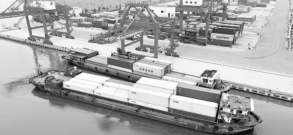 近日,随着巢湖湖区及各支流水位的回落,根据防汛工作实际情况,合肥港在确保安全的前提下恢复正常作业,货运船舶可以有序进出港口、装卸货物。图为8月21日拍摄的合肥港国际集装箱码头(无人机照片)。
