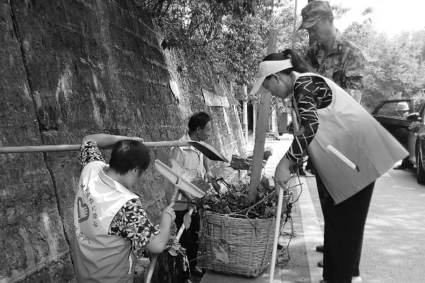 四川省内江市东兴区东兴街道平桥社区近日来了一群身着亮丽橙红色上衣的人,他们手拿着扫帚、簸箕、铲子等各种工具,顶着烈日开始劳动起来。他们就是东兴区民营经济志愿服务队的队员们。
