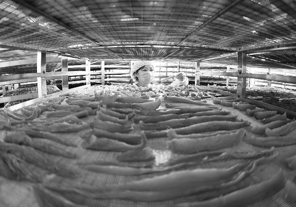 近日,河北省滦南县种植的3万多亩红薯新品种烟薯全面进入收获期,农民抢抓农时收获,深加工企业开足马力生产红薯食品。该县是河北省的传统农业大县,近年来通过引导农民采取“公司+合作社+农户”的模式,大力发展烟薯种植,带动农户增收。图为滦南县东黄坨镇一家红薯深加工企业的工人在薯干生产车间工作。