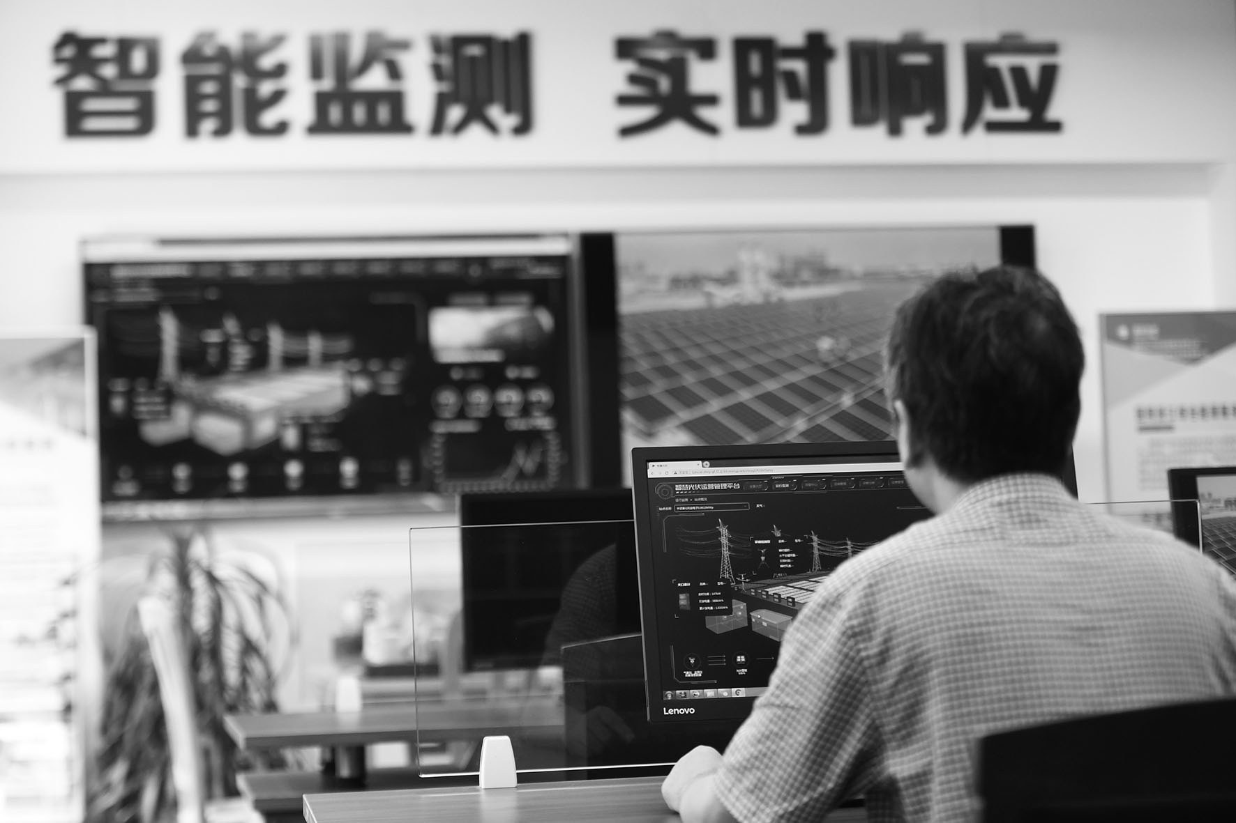 近日,380伏光伏电站智慧管理系统在宁波市奉化区投运,系统可实时监测分布式光伏电站的发电频率、电压等运行状况,对并网光伏电站运行情况实施精确掌控。图为技术人员在智慧光伏(浙东)分中心查看光伏电站智慧管理系统运行情况。